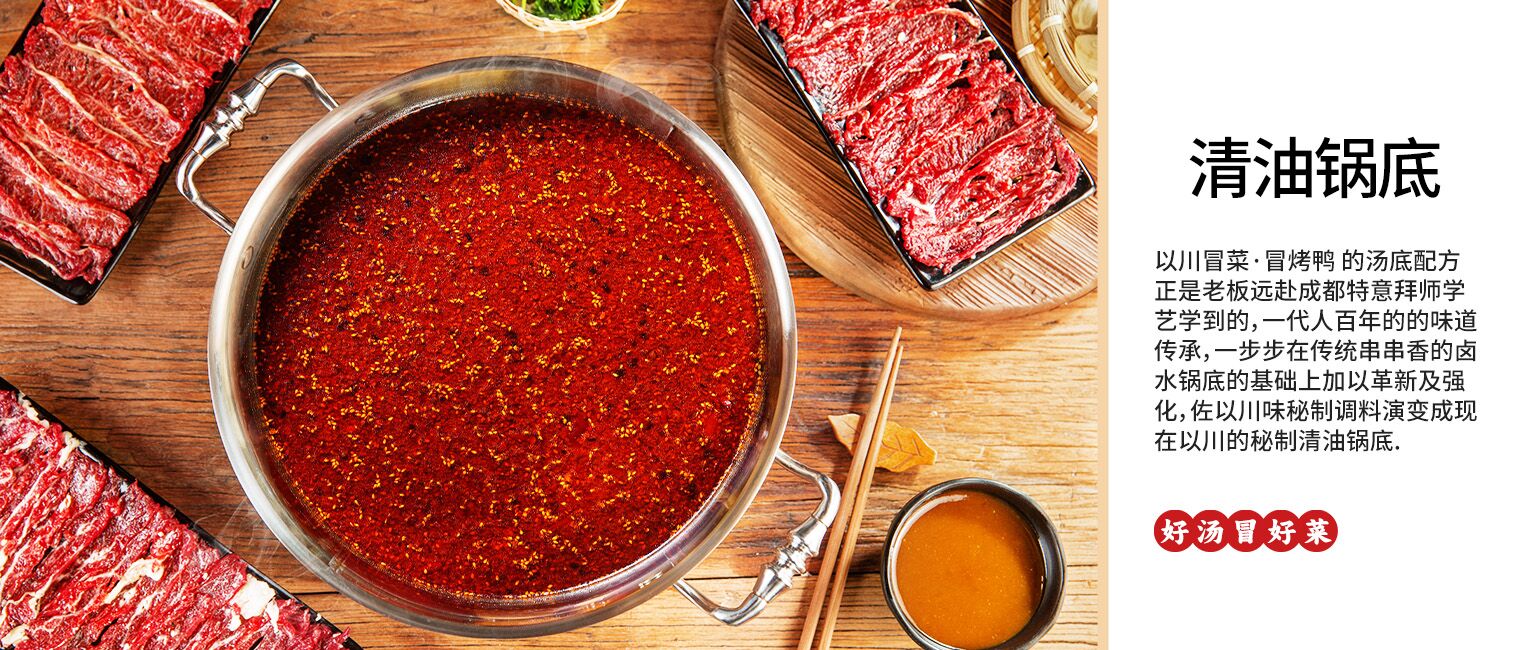 以川冒菜始终保持“用心做冒菜,专心做口味”为经营理念,传承四川地道文化精髓,汤底配方正是老板远赴成都拜师学艺学到的老四川精髓,两代人的的味道传承,一步步在传统串串香的卤水锅底的基础上加以革新及强化,佐以川味秘制调料演变成现在以川的秘制清油锅底.选用优质四川豆豉,上等红灯笼辣椒,天然菜籽油,牛油,高度白酒,糍粑辣椒,花椒,老姜,八角,香果.....等多种食材精心调制成口味地道纯正、口感麻辣鲜香的老成都冒菜汤底精髓,冒上一份烤鸭,加上特色的牛肉,味道香而不腻,辣而不燥,就着米饭那简直是地道的川味满足感!